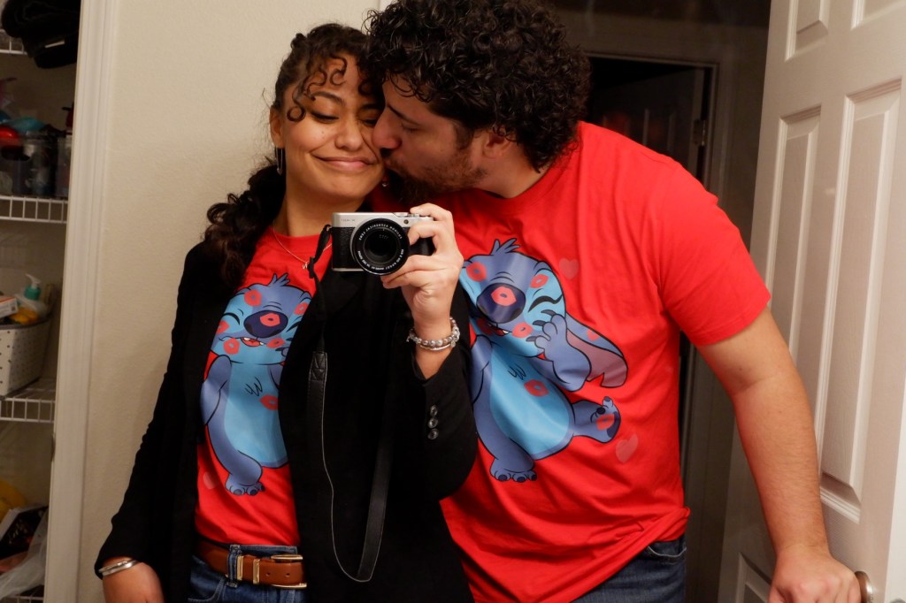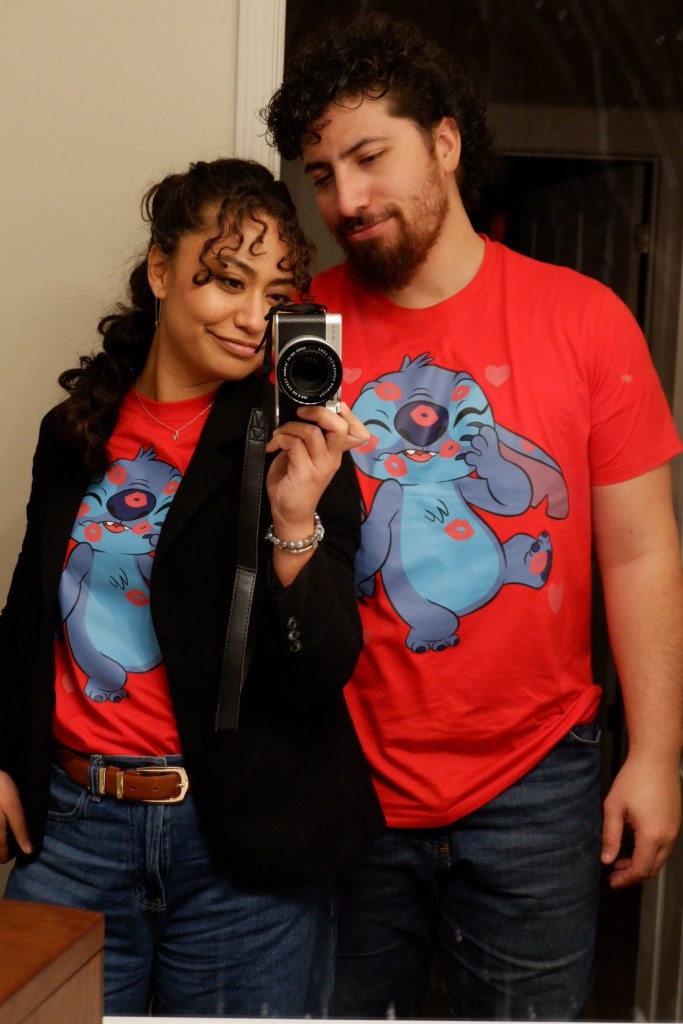Noah surprises me every day with his steadfastness, devotion, tenderness, and confidence: in me, in his love, and in the values he lives by. He helps me to rest – to set down my goals and my burdens and my worries and breathe, sleep, eat, and exercise until I’ve recharged enough to pick them back up. He’s so invested in listening to what I have to say that he asks me, of his own accord, what I dreamed about every morning, then proceeds to listen to the entire crazy rambling plotline and ask me follow-up questions. Occasionally, he even apologizes for things that the dream version of himself did, lol. He’s so trustworthy that my dog who’s notorious for hating men took to him on the first day he met her. On our first Valentine’s Day together, I gifted him a set of matching sweatshirts for him and me to wear – and ever since, he’s made it a point to surprise me with matching clothes on special occasions. This year, he suggested we wear matching shirts for Valentine’s Day, so we wore Lilo and Stitch themed shirts out on the town for our date night.