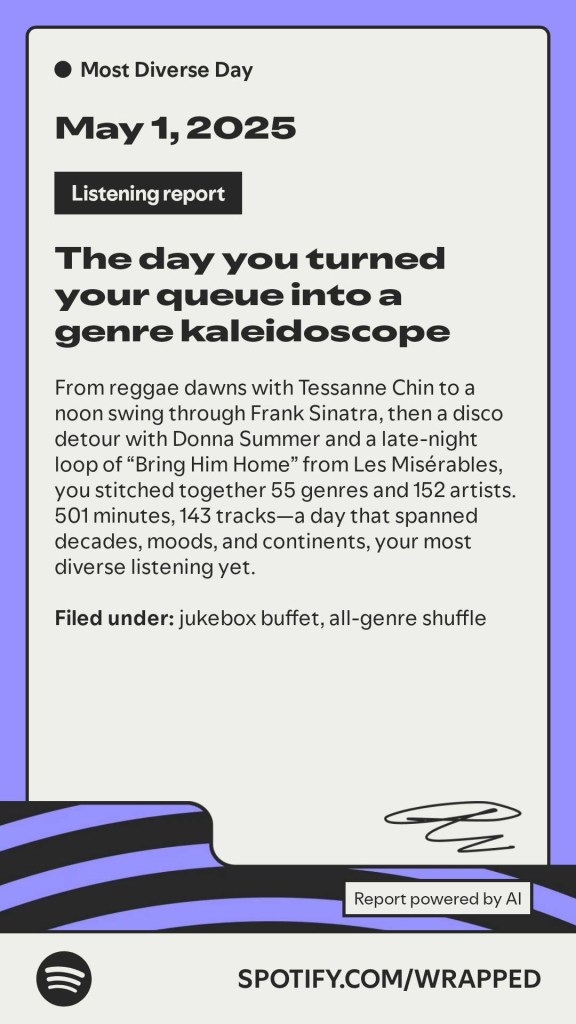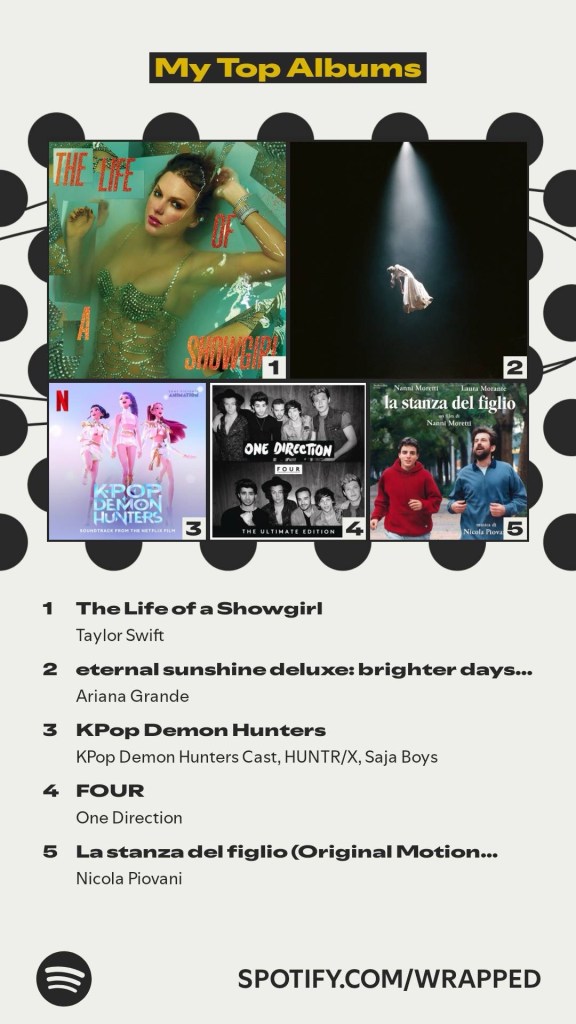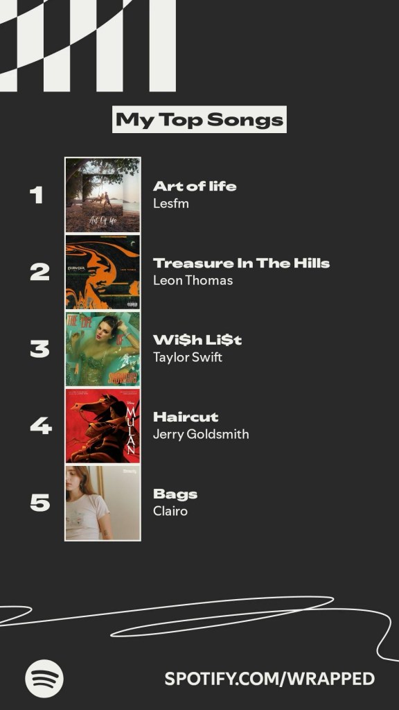 I’m not sure what I did differently in 2025, but I would like to confidently declare that this is my best Spotify Wrapped yet. Usually, my whole report is thrown way off by all the movie soundtracks and instrumental music I listen to (unironically). It’s all fun and games until your top 5 artists for the year are all composers.